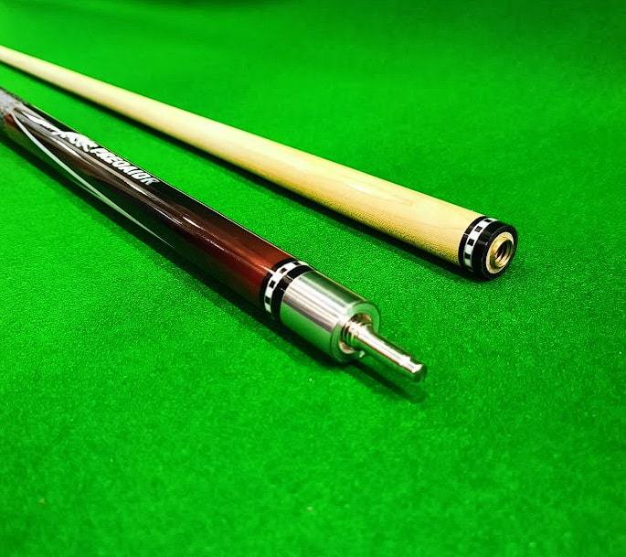 A two-piece wooden billiard cue designed for ease of transport and storage. It comes in a classic wooden brown color, offering a blend of elegance and high performance for every billiard player.