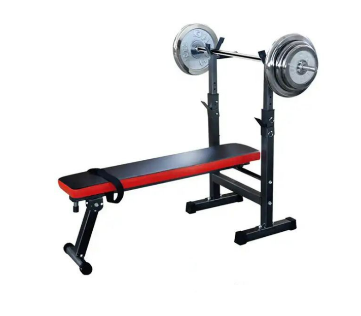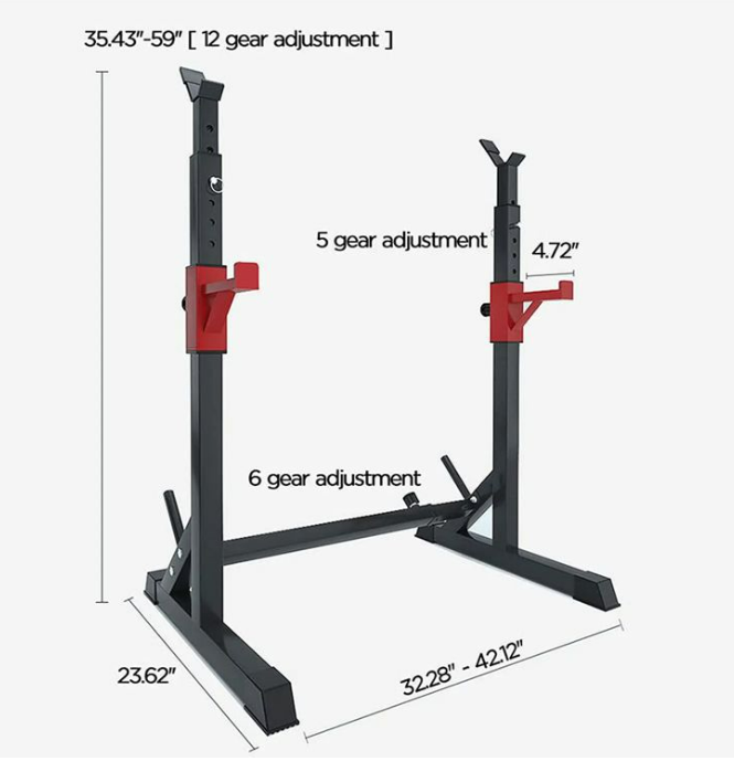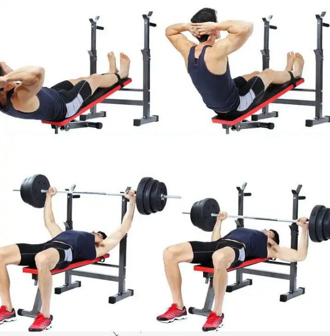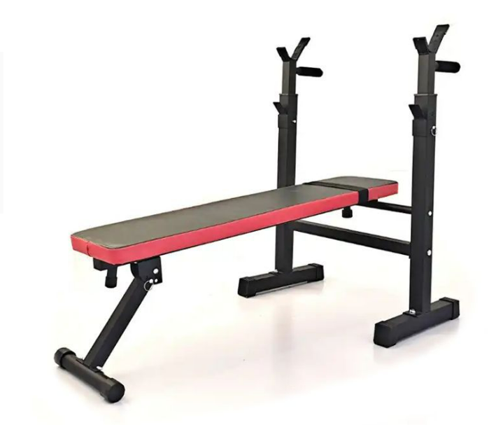Home gym training station with adjustable features, designed for weightlifting, squats, and dumbbell exercises. Includes press benches for a comprehensive workout experience. Perfect for lifting weights and enhancing your fitness in the comfort of your home.