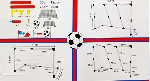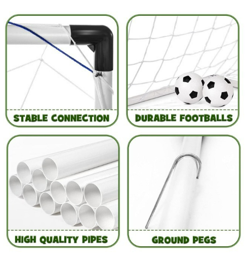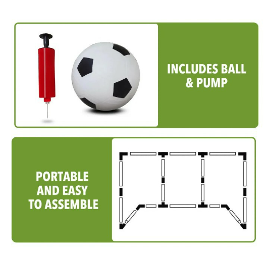 • Includes: 2 football goals/1 large goal, 2 football nets, 1 football, 1 air pump