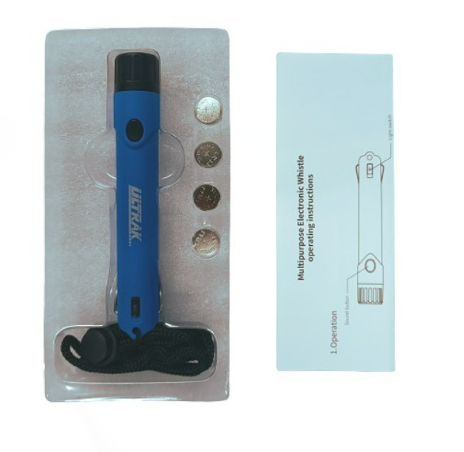 The H6370 electronic whistle features a durable and effective design with a length of 12 cm, a diameter of 2 cm, and a weight of 20 grams. It comes with a lanyard for hanging on the wrist or neck and includes 4 replacement LR44 button cell batteries. The whistle provides a high sound output that surpasses traditional whistles and offers a long operating time before needing battery replacement. Additional features include an LED light, making it ideal for referees, training, and emergency alerts. Warning: Do not use the whistle near the ears to prevent hearing damage, and it is not suitable for children. Replace the batteries when the sound becomes low or fails to operate normally.